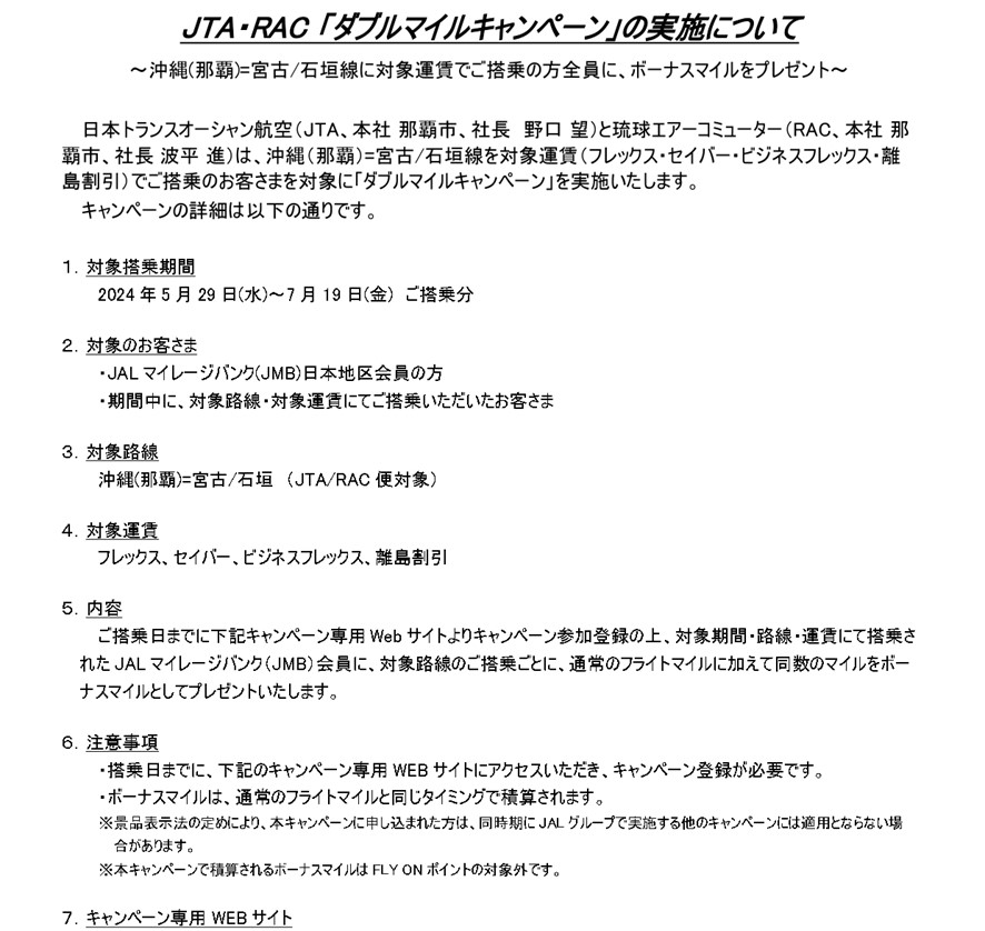 2024.05.29 JTA・RAC 「ダブルマイルキャンペーン」の実施について DOWNLOAD [132 KB] 2024年5月29日 第24011号 https://www.jal.co.jp/jp/ja/121campaign/2023/oka-bonusmile/ 以上