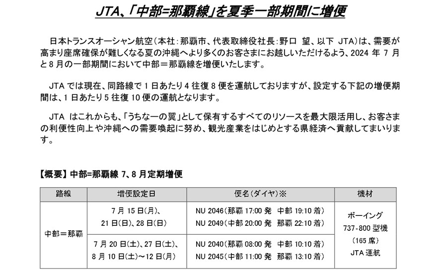 2024.06.19 JTA、「中部=那覇線」を夏季一部期間に増便 DOWNLOAD [214 KB] 2024年6月19日 第24018号 ※ 詳細はJALホームページをご参照ください。 https://www.jal.co.jp/jp/ja/ 以上
