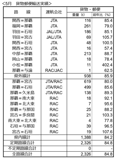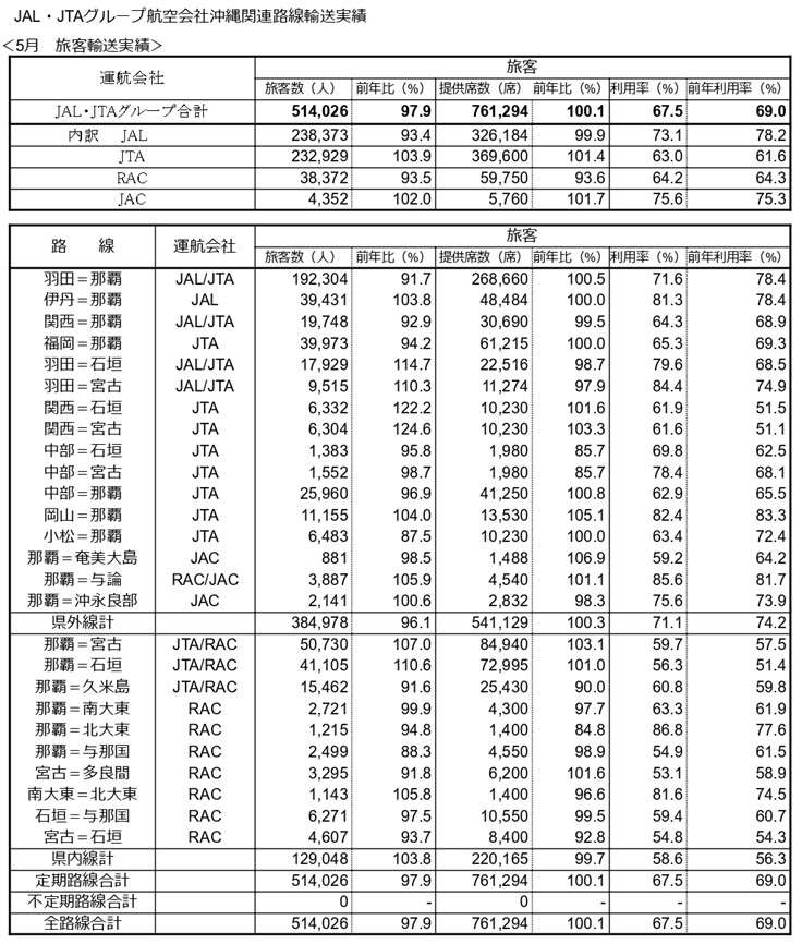 JAL・JTAグループ航空会社は沖縄関連路線について、2024年5月の輸送実績(速報値)をとりまとめましたのでご報告いたします。
