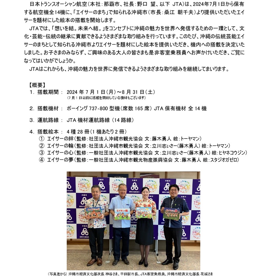 2024.06.28 JTA 機内に伝統芸能エイサーの絵本を搭載 DOWNLOAD [263 KB] 2024年6月28日 第24026号 JTA 機内に伝統芸能エイサーの絵本を搭載 ~エイサーのまち「沖縄市」より提供。保有機全14機へ~ 以上
