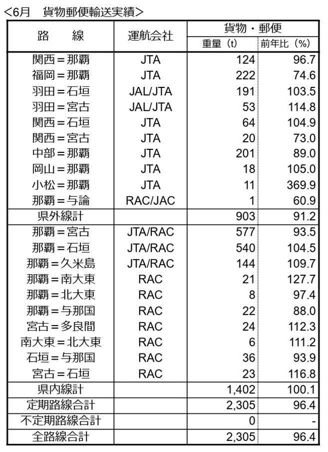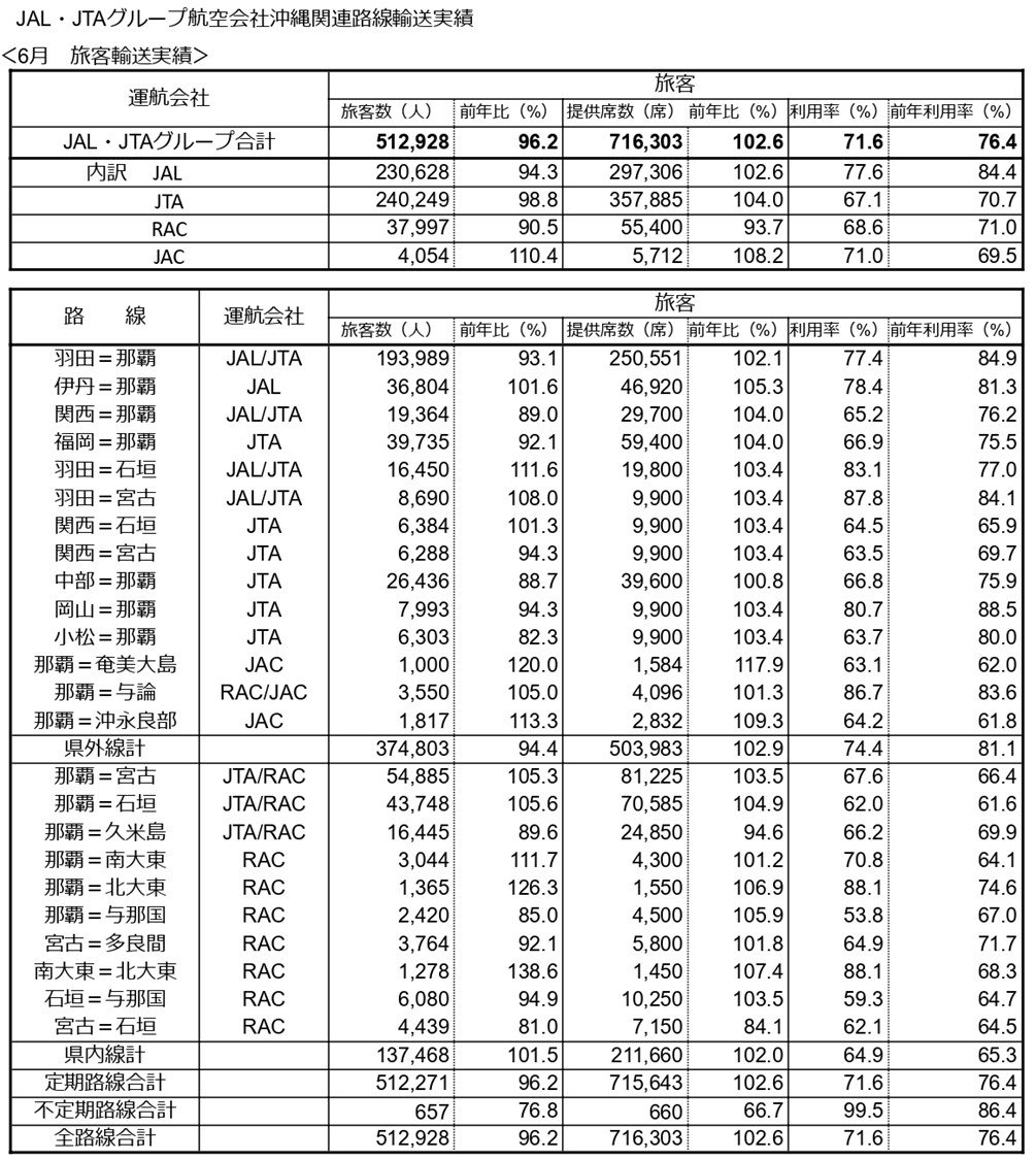 JAL・JTAグループ航空会社は沖縄関連路線について、2024年6月の輸送実績(速報値)をとりまとめましたのでご報告いたします。