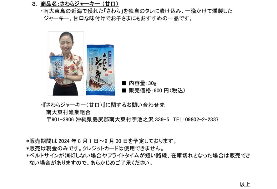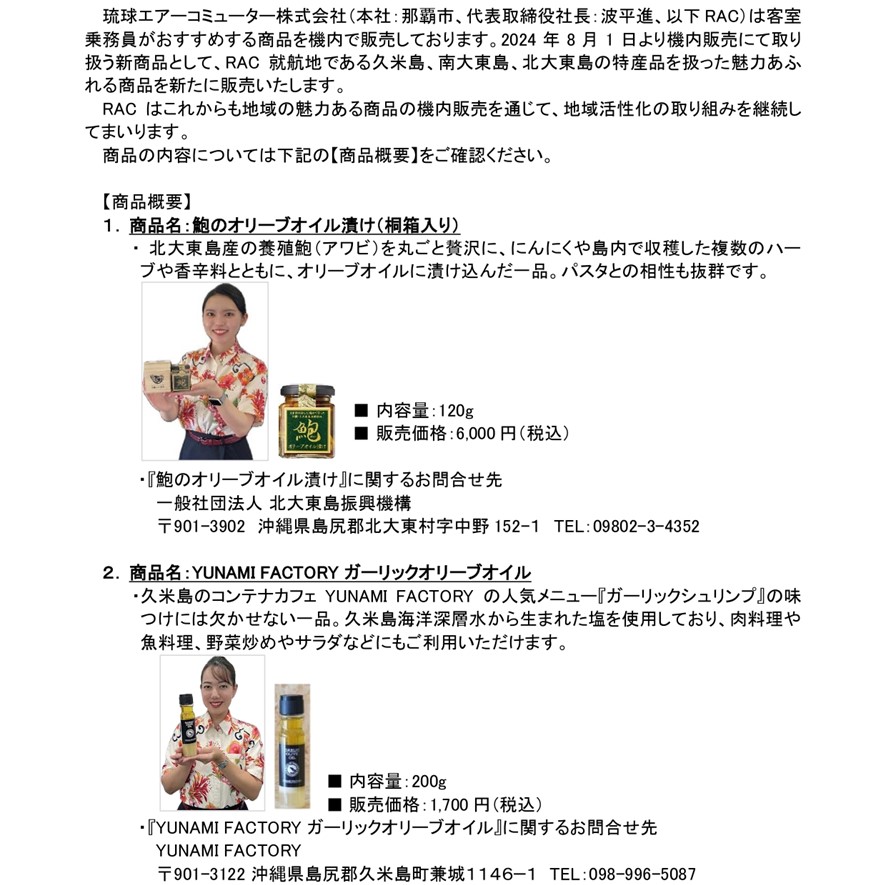 2024.07.31 RAC就航離島の魅力が詰まった商品を機内で販売します (8-9月) DOWNLOAD [284 KB] 2024年7月31日 第24031号 RAC就航離島の魅力が詰まった商品を機内で販売します(8-9月)