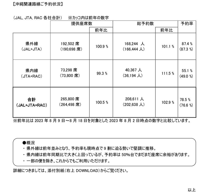 2024年度お盆期間(2024年8月9日~8月18日)について、JAL・JTAグループ航空会社便のご予約状況を取りまとめましたので、ご報告します。