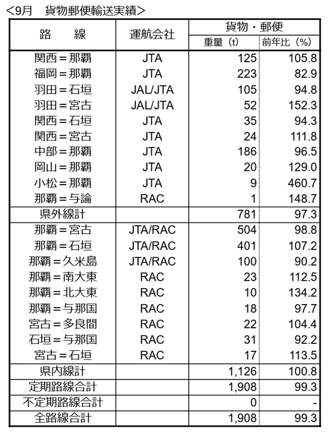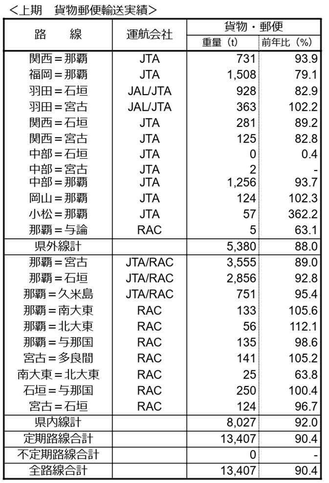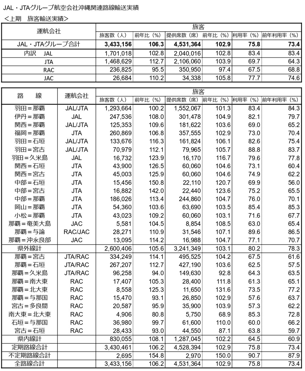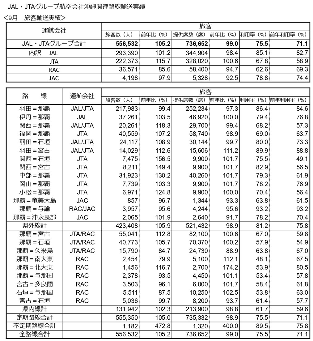 JAL・JTAグループ航空会社は沖縄関連路線について、2024年9月および2024年度上期(4~9月)の輸送実績(速報値)をとりまとめましたのでご報告いたします。