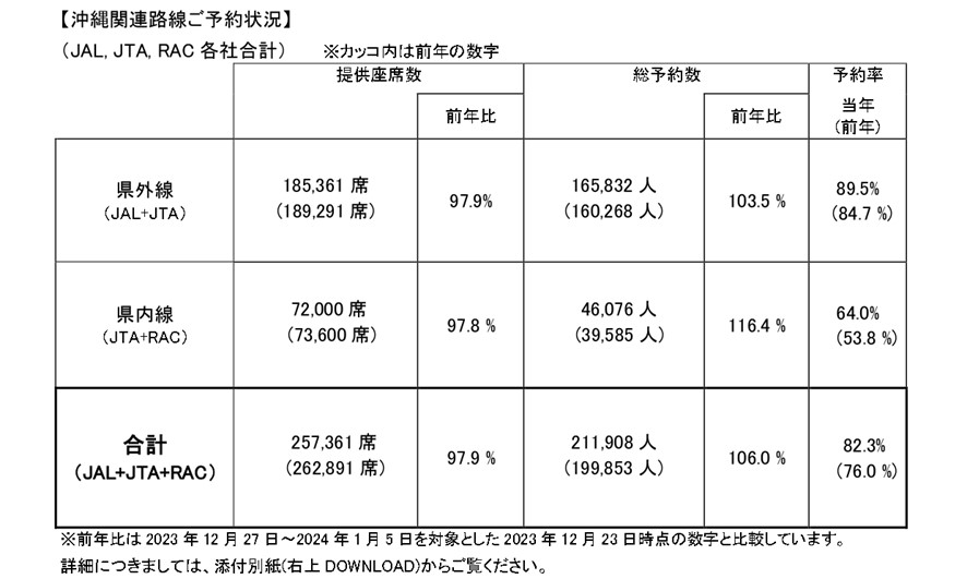2024年度年末年始期間(2024年12月27日~2025年1月5日)について、JAL・JTAグループ航空会社の沖縄関連路線ご予約状況を取りまとめましたので、ご報告します。