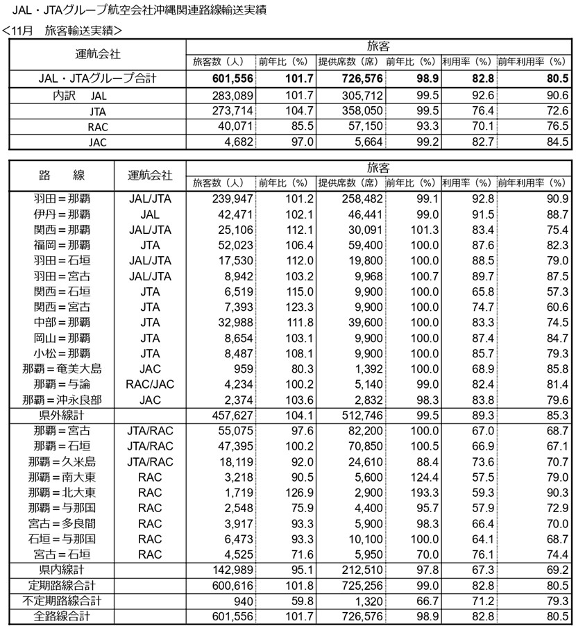 JAL・JTAグループ航空会社は沖縄関連路線について、2024年11月の輸送実績(速報値)をとりまとめましたのでご報告いたします。