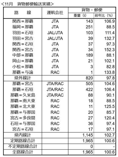 JAL・JTAグループ沖縄関連路線 月報(2024年11月速報値)