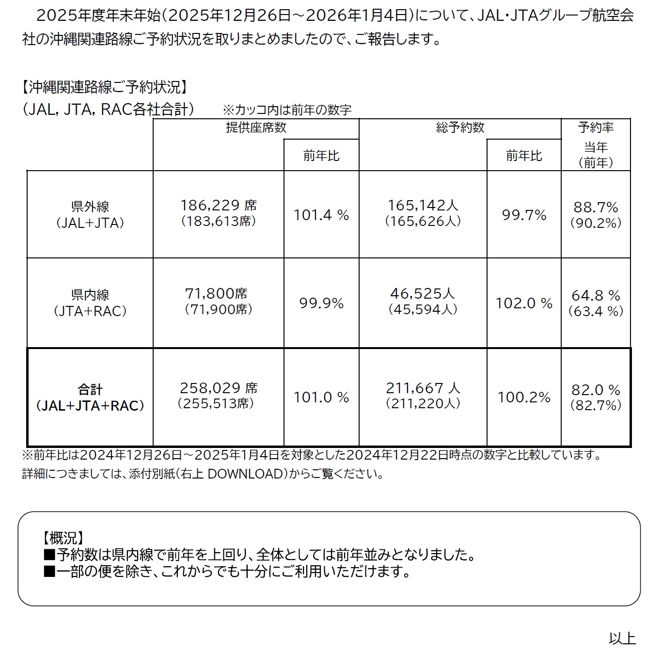 2025.12.22 JAL・JTAグループ 2025年度年末年始沖縄関連路線ご予約状況 DOWNLOAD [666 KB] 2025年12月22日 第25062号 JAL・JTAグループ 2025年度年末年始 沖縄関連路線 ご予約状況