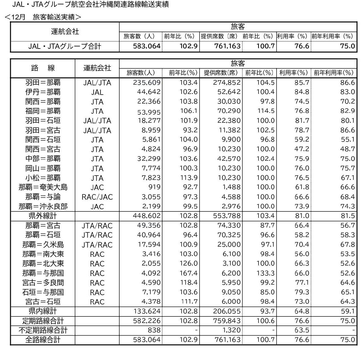 2026.01.23 JAL・JTAグループ沖縄関連路線 月報(2025年12月) DOWNLOAD [616 KB] 2026年1月23日 第25067号 JAL・JTAグループ航空会社は沖縄関連路線について、2025年12月の輸送実績をとりまとめましたのでご報告いたします。