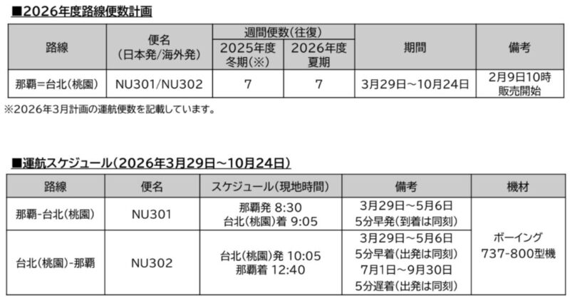 JTA、2026年度 那覇=台北(桃園)線路線便数計画を決定 NEW