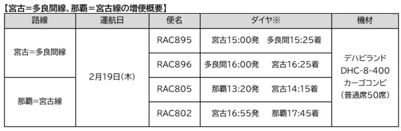 琉球エアーコミューター(本社:那覇市、代表取締役社長:山田 賢哉、以下RAC)は、2月の宮古=多良間線、那覇=宮古線において定期増便を追加決定いたしました。