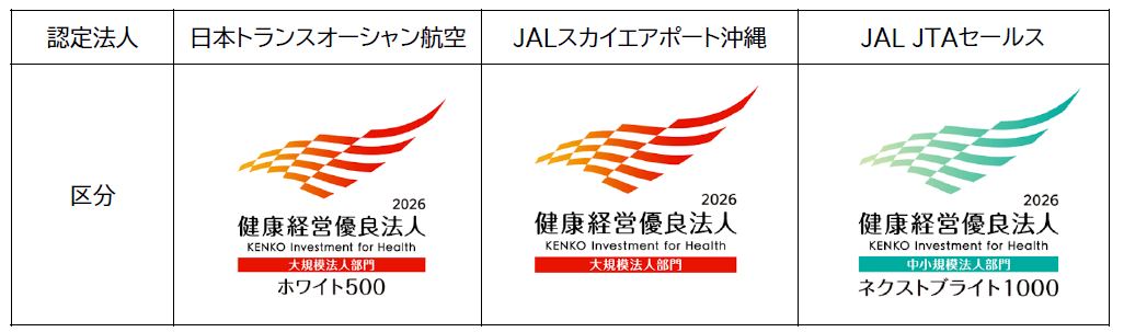 沖縄地区JALグループ3社は、日本健康会議が実施する「健康経営優良法人2026」に認定されました。そのうち、日本トランスオーシャン航空(JTA、本社:那覇市、社長 野口 望)は、大規模法人部門の上位認定である「ホワイト500」に2018年より9年連続の認定となりました。またJALJTAセールス(JJS、本社:那覇市、社長 中根 雅典)が中小規模法人部門の上位認定である「ネクストブライト1000」に、JALスカイエアポート沖縄(JLSAO、本社:那覇市、社長 大竹 勇次郎)は大規模法人部門で認定されました。