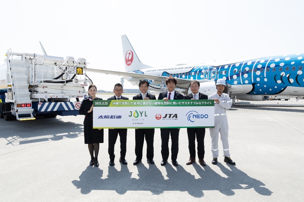 株式会社J-オイルミルズ(本社:東京都中央区、代表取締役社長執行役員 CEO:佐藤 達也)、日本トランスオーシャン航空株式会社(JTA、本社:沖縄県那覇市、代表取締役社長:野口 望)、太陽石油株式会社(本社:東京都千代田区、代表取締役社長:山本 堯大)、NEDO(国立研究開発法人新エネルギー・産業技術総合開発機構)は、3月25日(火)に、沖縄那覇発宮古島行のJTA565便において、燃料の一部に沖縄県で採取した食用に適さない植物の種子(テリハボクおよびポンガミア※1)から生成した国産SAF(持続可能な航空燃料)※2を用いたフライトを実施しました。本施策は、NEDO助成事業である「バイオジェット燃料生産技術開発事業/実証を通じたサプライチェーンモデルの構築」(以下、本事業)の一環で実行しました。