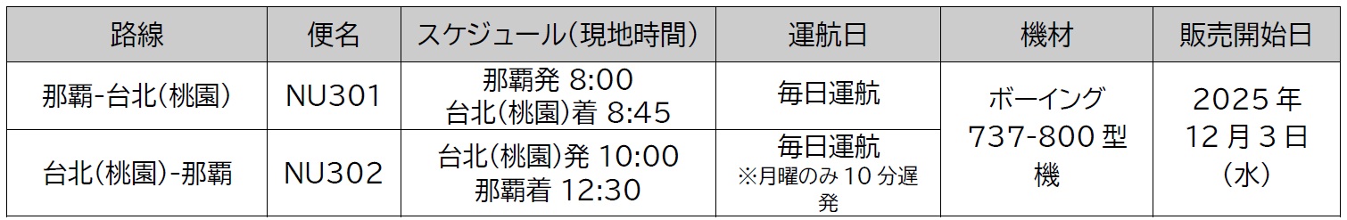 那覇=台北(桃園)線の運航スケジュールを決定し、2026年2月3日(火)より毎日運航します。航空券の販売は2025年12月3日(水) 10:00から開始します。